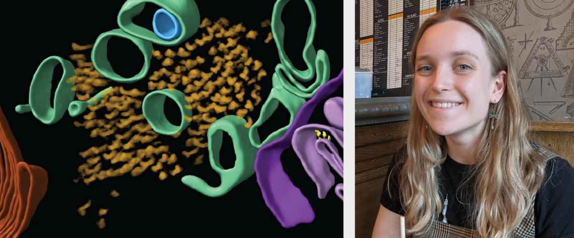 Die Alzheimer-Krankheit (AD) ist die häufigste Ursache für Demenz. Charakteristisch für AD ist die Selbstaggregation der Proteine Aβ und Tau zu fadenförmigen Strukturen, sogenannten Amyloiden, die pathologische Ablagerungen bilden. Diese stören die normale Funktion von Nervenzellen und tragen zu deren Absterben bei. Im Rahmen ihres Promotionsprojekts hat Madeleine Gilbert kryogene Elektronentomographie (cryoET) eingesetzt, um Aβ und Tau direkt im Gehirngewebe von Alzheimer-Patient:innen zu untersuchen. Dabei konnte sie neuartige Bestandteile von Aβ-Ablagerungen identifizieren, Unterschiede in der Organisation von Amyloidstrukturen entdecken und erstmals die strukturelle Faltung von Amyloidfilamenten in situ, also im nativen Gewebe, sichtbar machen. Diese Erkenntnisse liefern neue Einblicke in die Aggregation von Amyloid im Alzheimer-Gehirn und erweitern das Verständnis neurodegenerativer Erkrankungen.